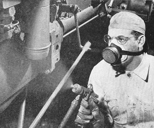Two men spray each tractor. They wear canvas gloves, coveralls, and chemical cartridge respirators. The respirator protects the painters from the solvent fumes used in paint and also from small particles of paint which may not have been eliminated through the regular exhaust system, although this system is more than adequate. These particles are most likely to be encountered when the sprayman is bending over to reach the lower sections of the tractor. Each day the sprayman receives a cleaned, sterile respirator from the Personal Protective Equipment Headquarters.