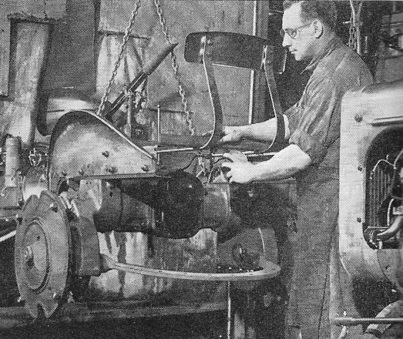 After the paint has been applied, the tractor moves into the drying oven, a cave-like affair, 85 feet long. Inside, the tractors bask for 30 minutes in temperatures that reach 180˚ to 200˚ when the tractor reaches the center of the oven. The temperature is regulated according to the model of the tractor and the rate of production in effect at the time. When the tractor leaves the drying oven, it is garbed in a bright shiny, permanent coat of orange paint. At this time the storage battery, steering wheel, and tires are put onto the tractor.