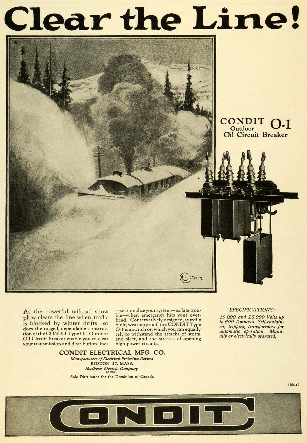 Condit Electric Mfg. Co. was a subsidiary of the American Brown Boveri Company. The latter was a branch the of the Swiss based company, Brown Boveri. The firm expanded in the United States in October 1925 in Camden, New Jersey. The company prospered during World War I by building ships and machines that were installed on the ships. They wanted to shift production to turbines, generators. transformers, and other electrical equipment. The Condit Electric Mfg. Co. of Boston was acquired for their production of electrical switch gears. The Condit Electric Mfg. Co. was known for oil circuit breakers, on both indoor and outdoor sizes. Other firms across the U.S. were also bought out to add more lines of equipment to the company.