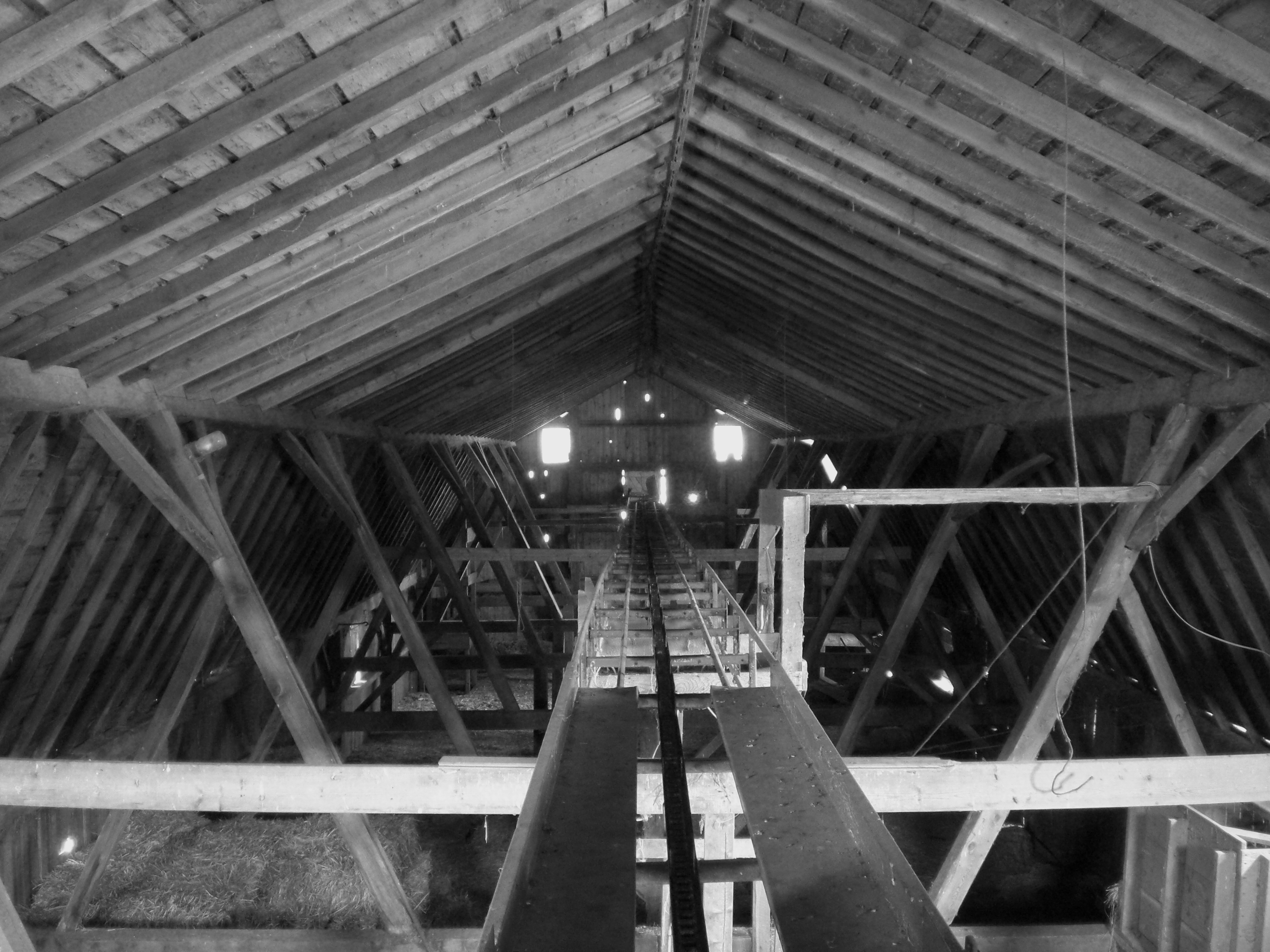 The dairy barn’s structure has changed dramatically over the years. Our barn was built with a mortise and tenon frame, which required a lot of skilled woodworkers to build. As time went on, constructing barns in this fashion gave way to the cheaper plank frame. The open-style hayloft of the plank frame barns made movement of hay in the loft faster; free from obstruction of mortise and tenon framing.