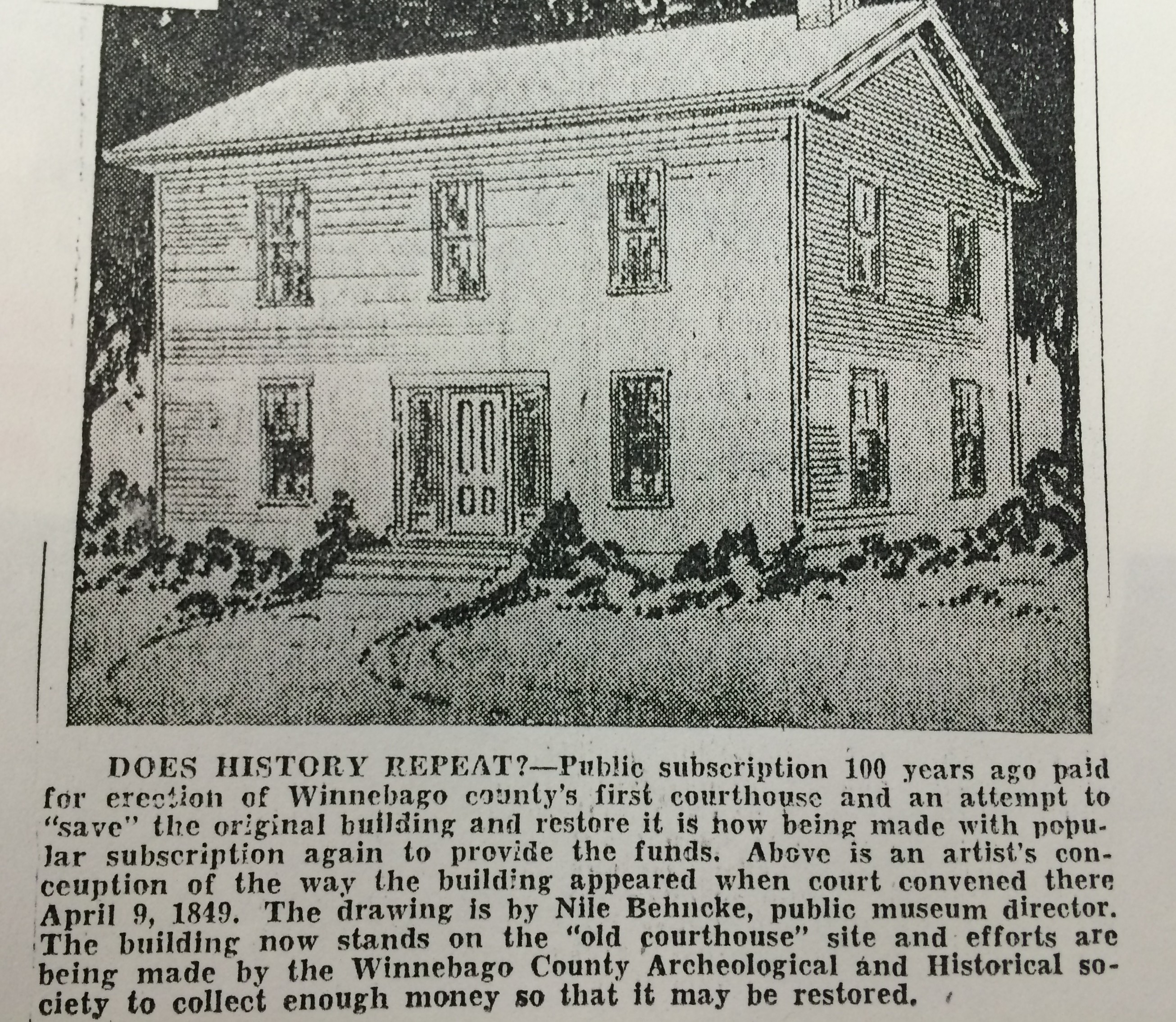 A few blocks away, the original courthouse built sometime around 1849 was also standing. Nearly 100 years later it was used as a warehouse by the Marquart Millwork Company on Ceape Street. Around 1944, the Winnebago Historical and Archeological Society considered the idea of saving the structure. The building was in poor shape and deemed a fire hazard. The society did not want to lose this historic building, so mill owners gave the building to the organization. In 1947, the building was successfully moved off the mill site and relocated to the original courthouse grounds owned by the city. The historical society was assisted by the county board and the city in moving the structure. The local newspaper expressed the historical society intentions to repair and preserve the old courthouse: