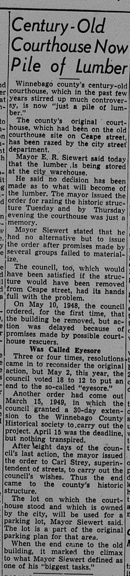 Designation of the original courthouse as an historical shrine will await repairs and improvements to the structure. An early fall program is contemplated by the Winnebago County Archeological Society (sic) at which time dedication exercises will be conducted in a public ceremony. ( July 10, 1947, Oshkosh Daily Northwestern)