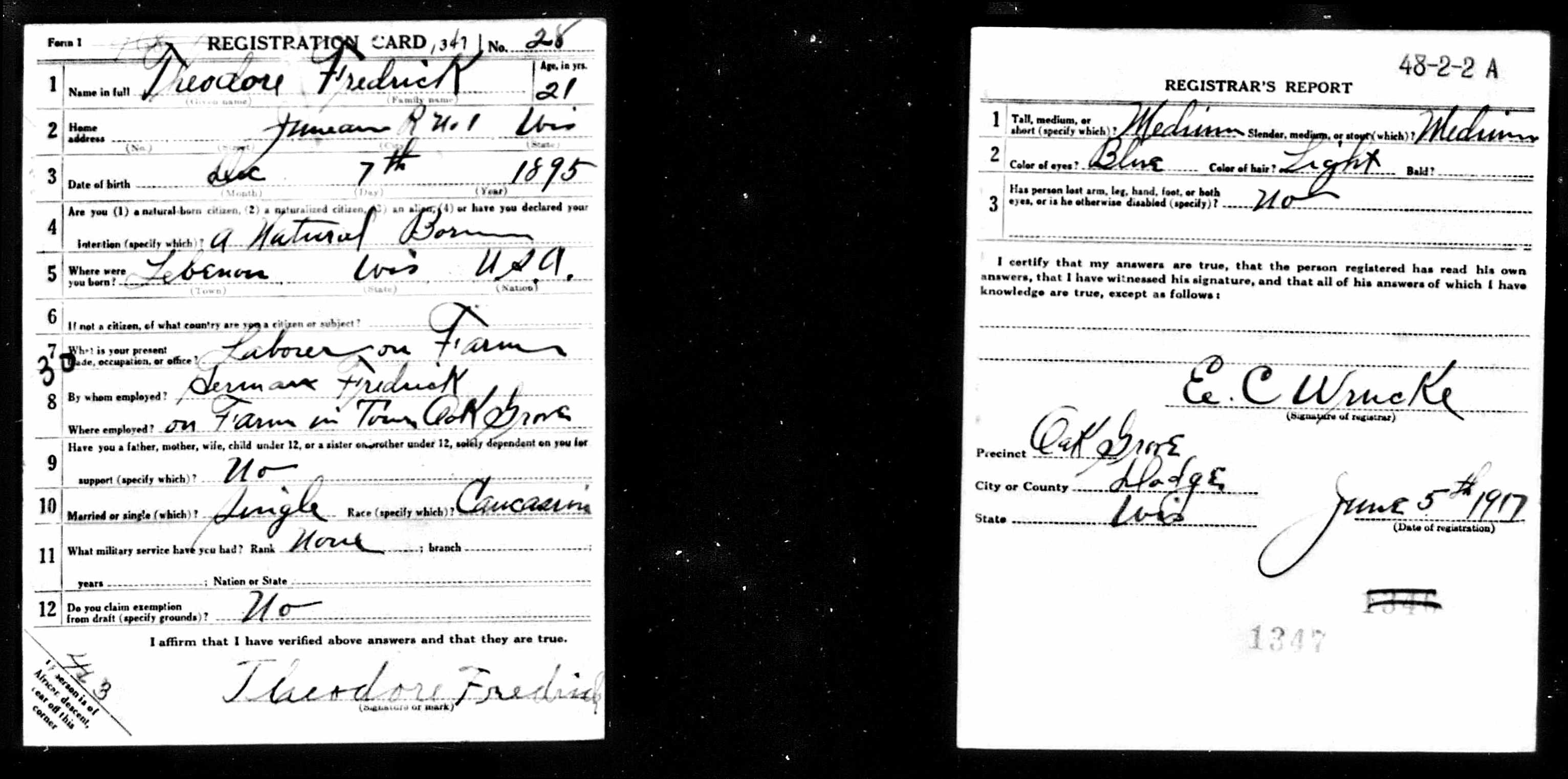 Theodore Fredrick was born on December 7, 1895. He was a son of Carl and Bertha Fredrick. Carl was a brother of my great-grandfather, Arthur Frederick. That would make Theodore my first cousin twice removed. Theodore was required to do what millions of other young men had to do at the beginning of US involvement; he went and registered for the draft in June 1917.