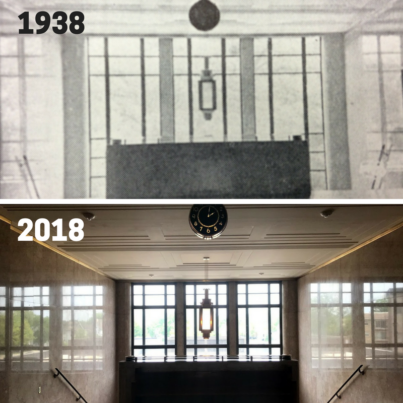 I am on the board of the Winnebago County Historical & Archaeological Society and thought it would be a great way for our organization to be involved in local preservation. I shared the idea with our board of directors, and they were excited about the idea of helping put this light back in the courthouse. So I decided to talk to the building’s new owners, Kris and Sarrah Larson, and share the significance of the light and what we were trying to do. The Larsons also run Wagner Market which is a small grocery store and meat market in a portion of their building. Molly and I stop in the from time to time to get jerky, craft beer, and locally made cheese. I stopped in and bought some of the chocolate covered almonds that Molly loves, and I asked Sarrah if she knew that the light fixture in their lobby came out of the Winnebago County Courthouse. She was surprised, so I showed her the picture of the lobby from 1938. I asked her if she would be willing to work with us and arrange to get the light back to the courthouse. She said she would be happy to work that out. Her one request was that we find her a replacement light to put in her lobby.