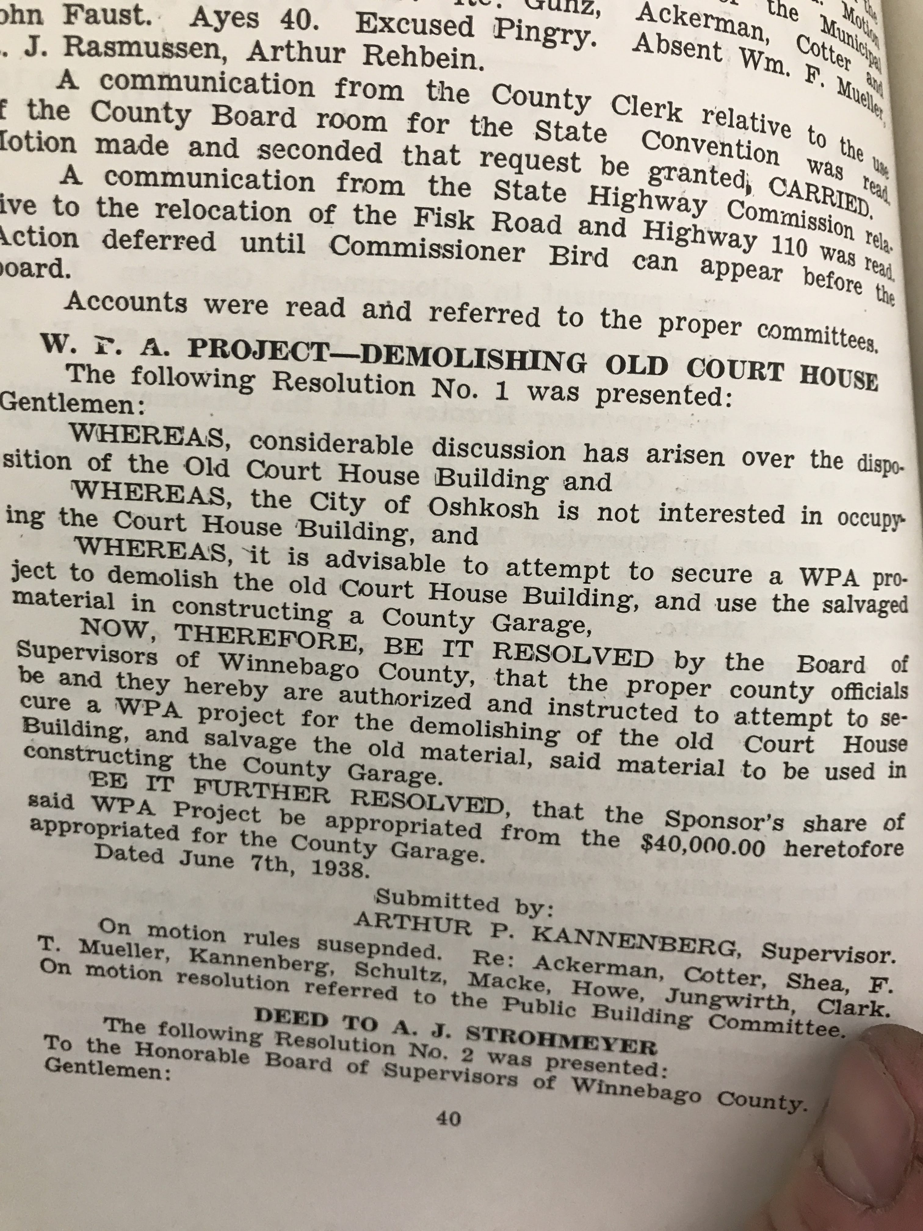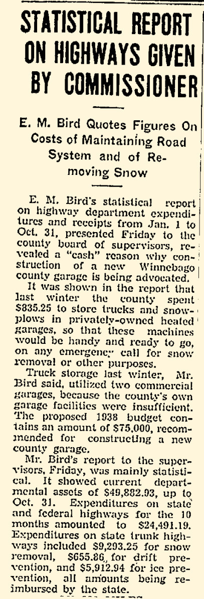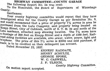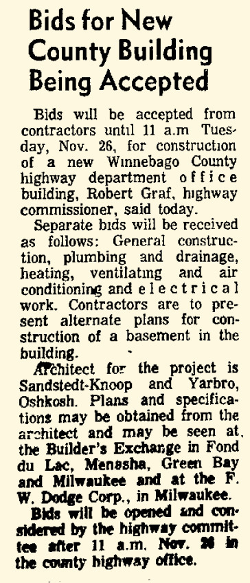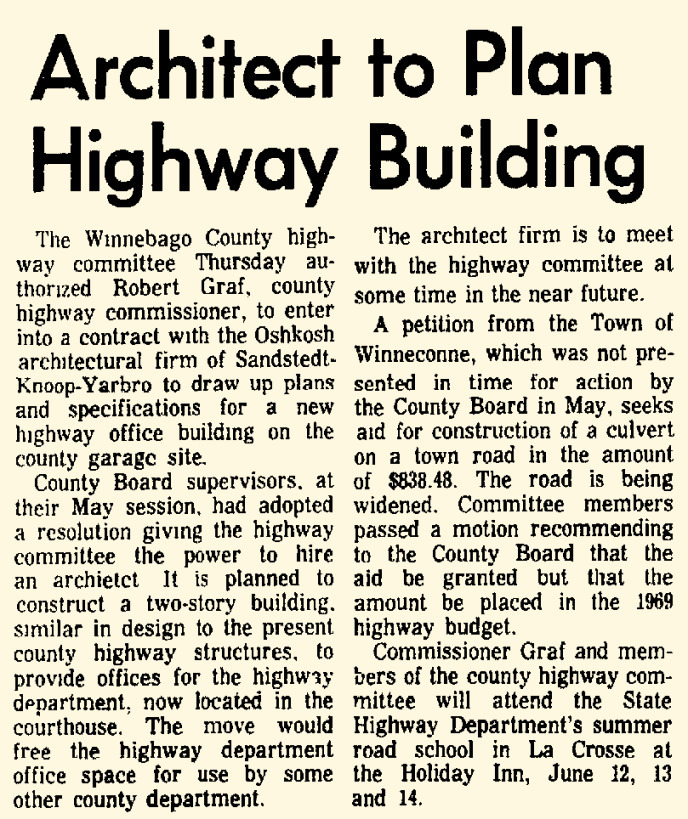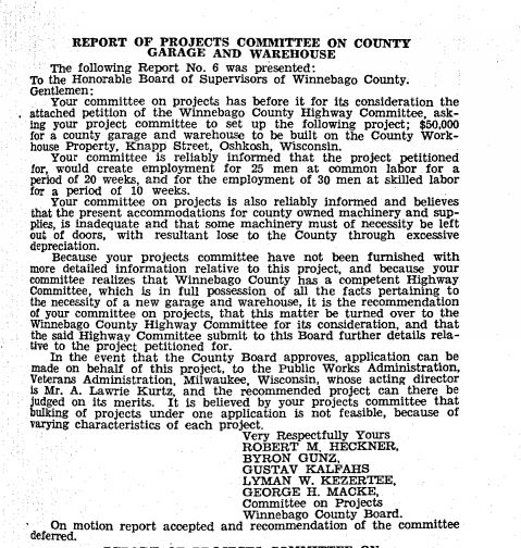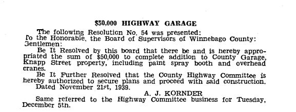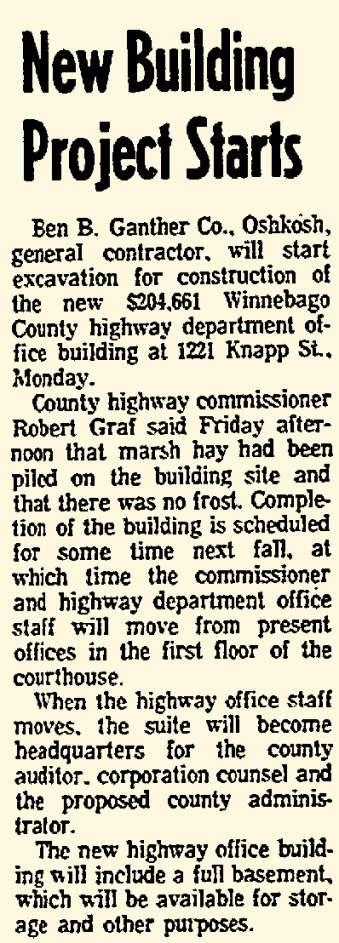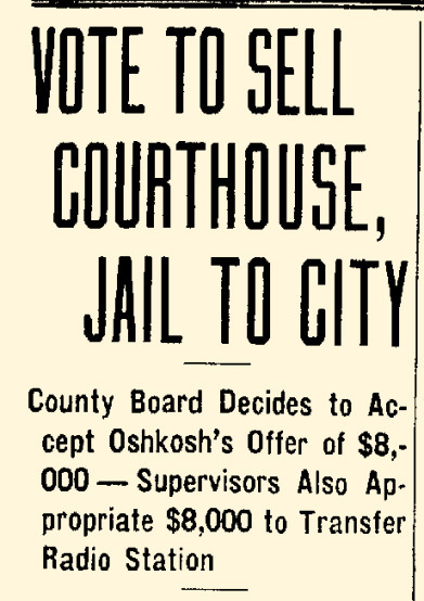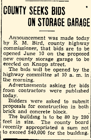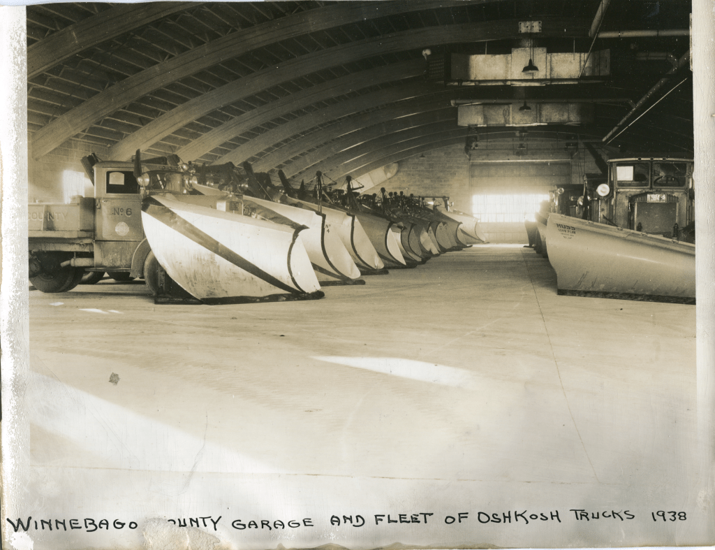 In Michael Goc’s book A History of the Winnebago County Highway Department and Its Roads he asserts that the Winnebago County Board had approved the garage to be built with salvaged materials from the former Winnebago County Courthouse on Otter Street. I was really excited to read that, but as I investigated further it turns out that his information is only half correct. There is mention of plans to look into salvaging the courthouse in county board’s meeting minutes from 1938. However, the garage, nor subsequent additions, was never constructed with any of the salvaged materials. The storage garage was completed by November 1938, and the old courthouse was not dismantled until mid-1939. Furthermore, the old courthouse property was sold to the City of Oshkosh in January 1939, and it was the CITY that pursued WPA funding to dismantle the building and salvage the materials to be used for city projects–I’ll have another post on that in the future!