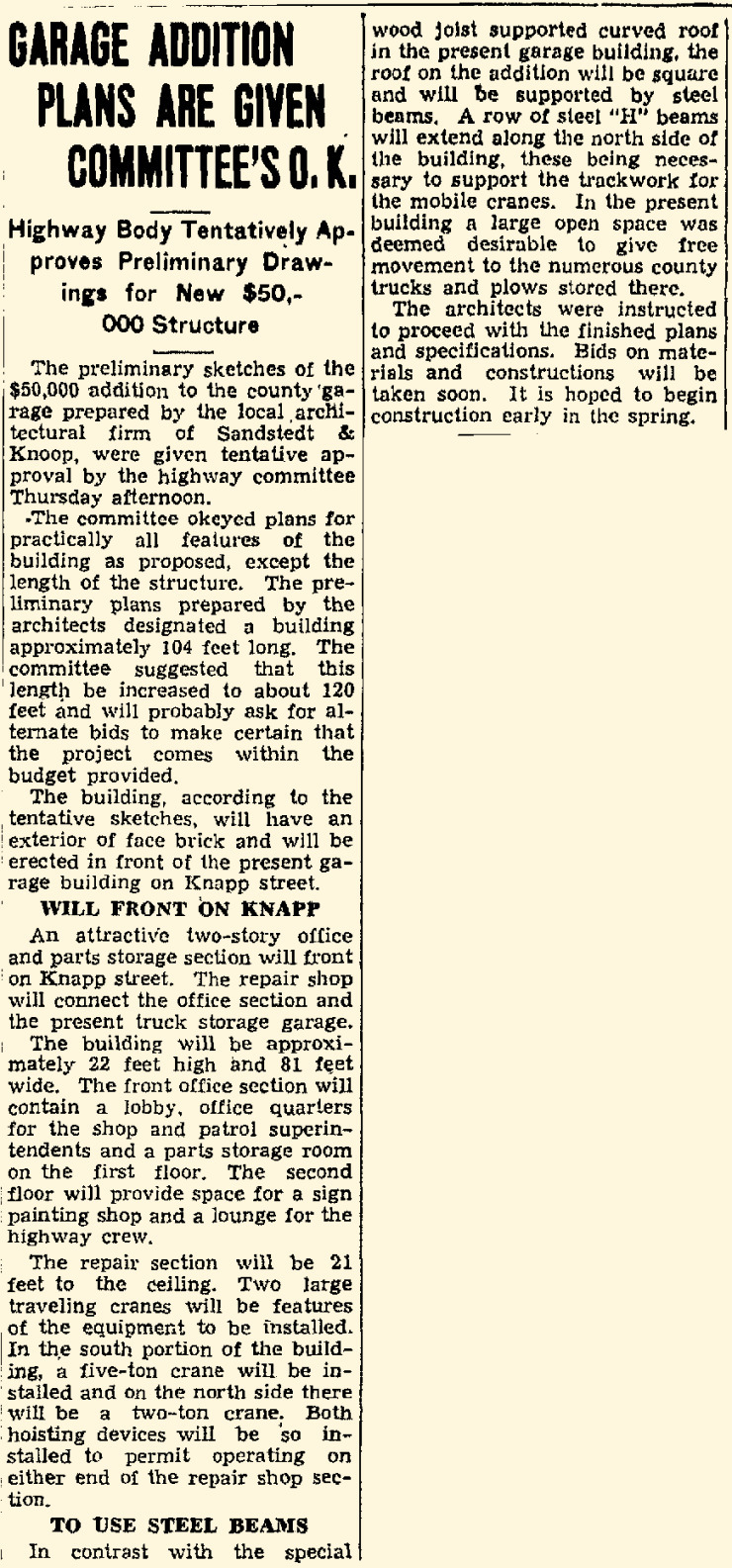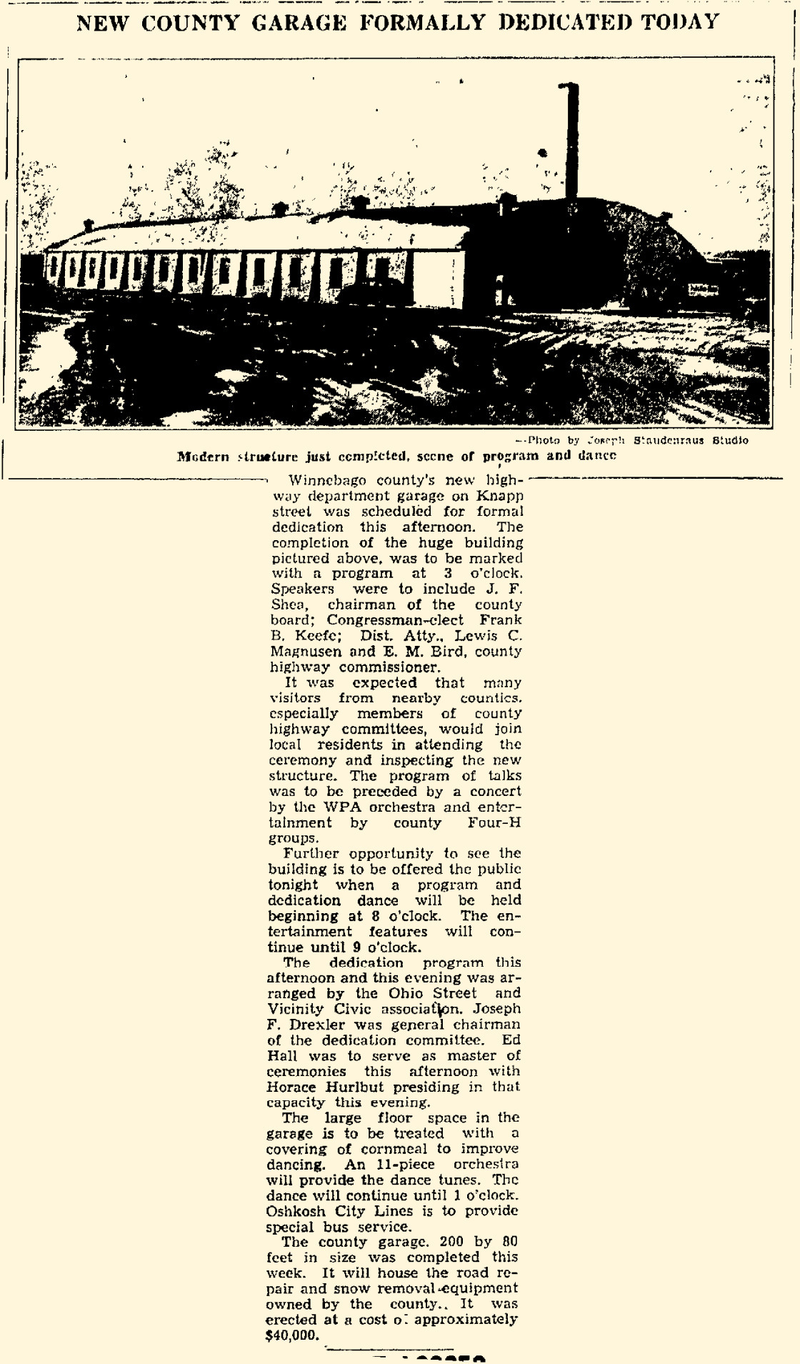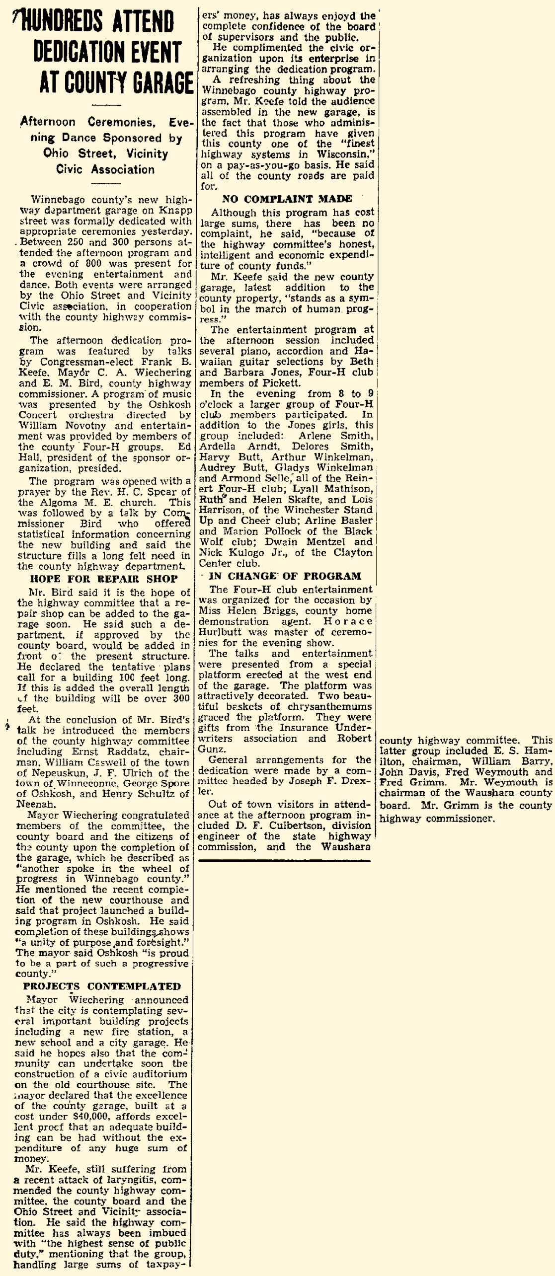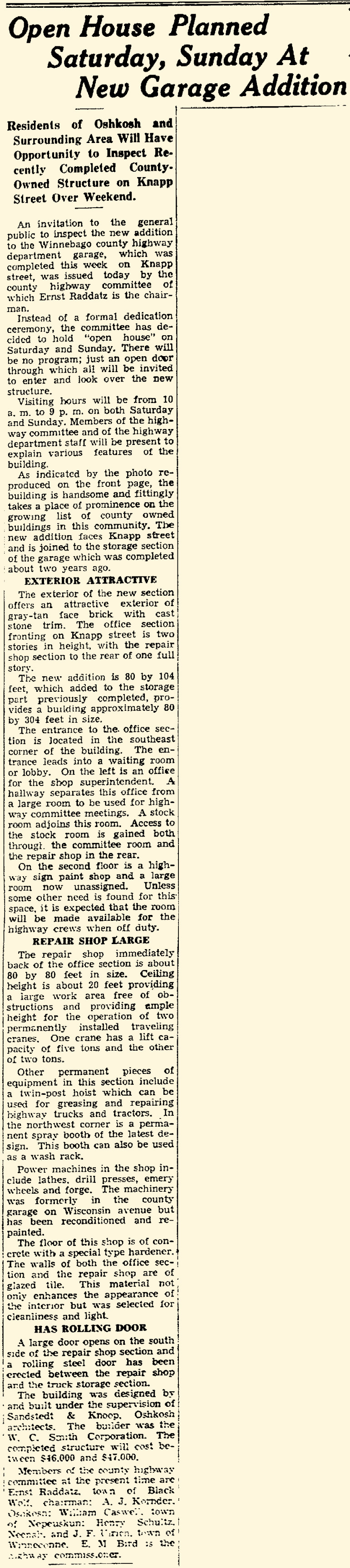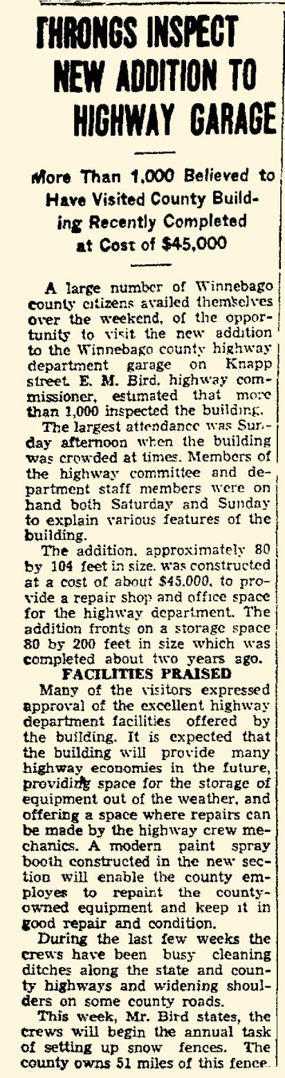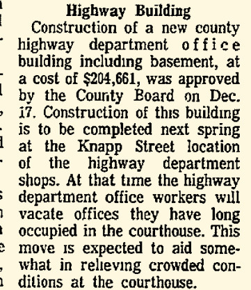 The new garage was built to relocate and house the county plow trucks and equipment from its former Wisconsin Street garage. Some of the county plow trucks were also being stored in private garages due to the lack of space. By the time the garage was finished, the County Highway Committee was already looking to build a repair shop onto the new garage in the near future. A dedication ceremony and big dance–over 800 people— was held in the building to celebrate the county’s newest facility.