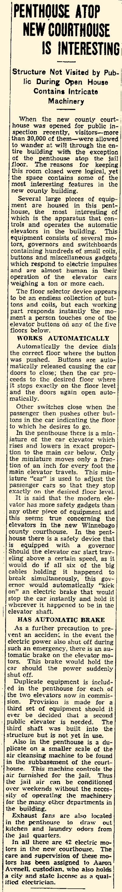 The Winnebago County Courthouse elevator equipment has been in service since 1938, and sooner or later it will be replaced. Although it seems antiquated to us, back when the building opened it was considered top-of-the-line equipment. Three elevator shafts were built–two for public elevators and one for a jail elevator. A public elevator car and the jail car were installed at construction. The second passenger shaft was equipped with a car, mechanical and electrical equipment years later.