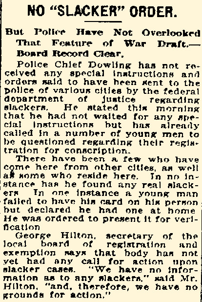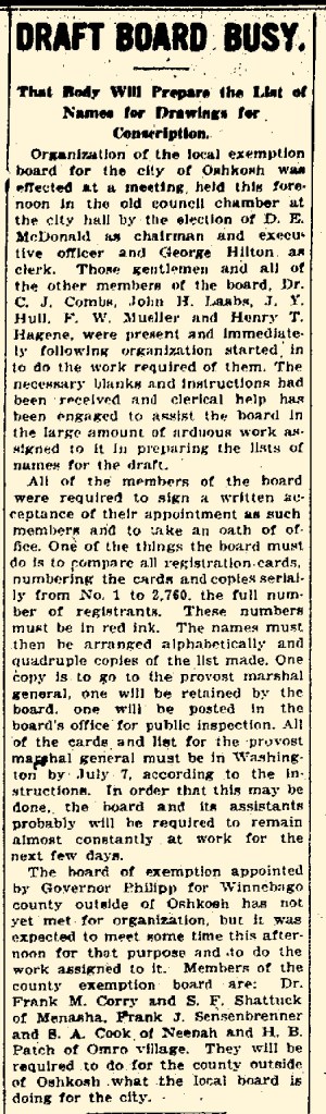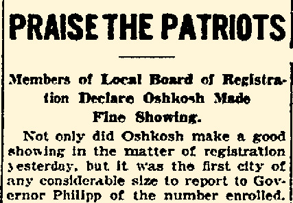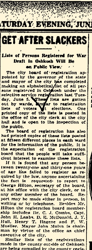 From what I have been able to find through initial research, Oshkosh was relatively slacker free when it came to draft registration. There were a few cases of accused slackers, but they seemed to have either been a case of misunderstanding or false accusations. The term “slacker” extended to other people, too. That will be the subject of Part II of this series.