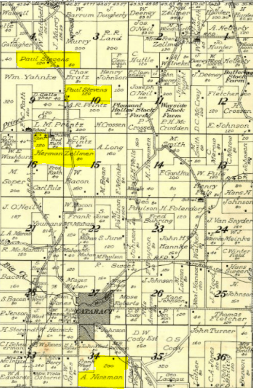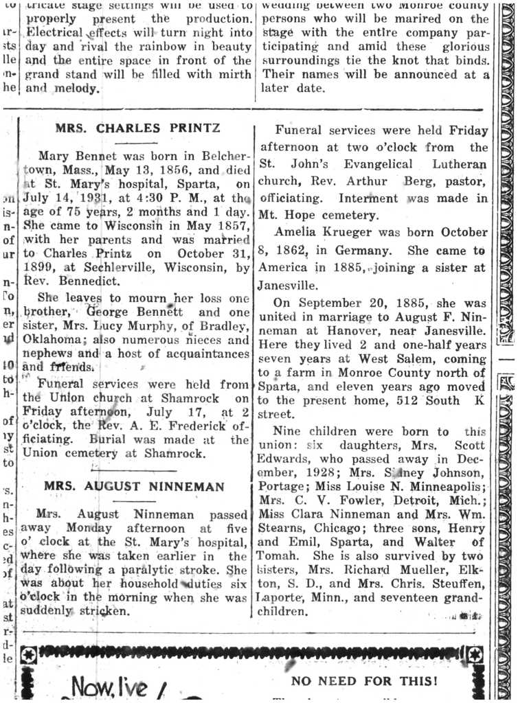 The biggest clue was a birth record that revealed her mother’s maiden name was Krueger, which is the same as Ella’s mother–Wilhelmina (Kruger) Zillmer. Was that the connection? I am almost certain it is. I found Amelia (Krueger) Ninneman’s obit, and it says that she emigrated from Germany to the United States in 1885 and joined her sister in Janesville, Wisconsin. Wilhelmina came in 1882 and married Herman Zillmer in 1882 near Janesville. These two must be sisters.