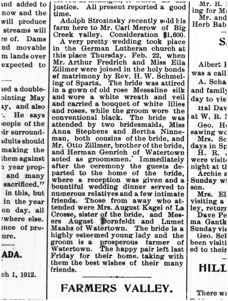 All it took was a little nugget of information that fell from the sky, well, it actually came from my 3rd cousin once removed, I received copies of Great Grandma and Grandpa’s wedding announcement published in the Sparta Herald. The Monroe County Historical Society has an amazing database of family history sources–news clippings, photos, obits, birth announcements, marriages, etc. which is exactly where my cousin got the info from. Now I have the names and relationships of the people who stood up at their wedding.