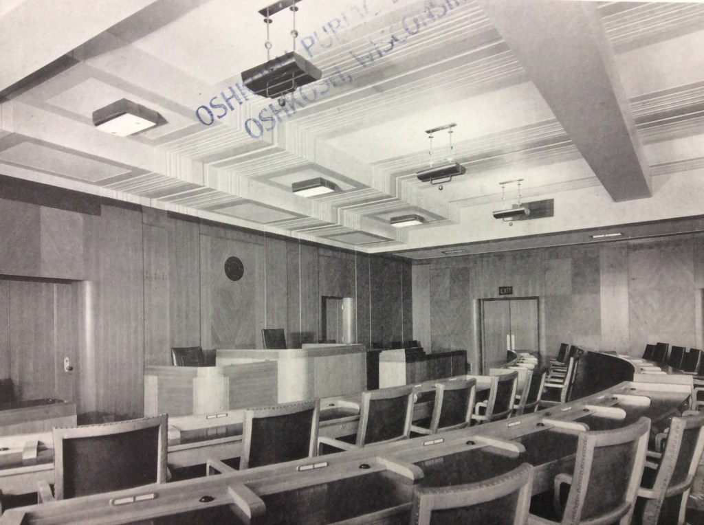 These two lights were original fixtures that once lit the county board room in the courthouse. Like the other lights, these were manufactured by the Westinghouse company. Sadly, these were removed from the building during upgrades performed throughout the building in the late 1960s. The story goes that county board members at that time were salvaging them out of the dumpsters.