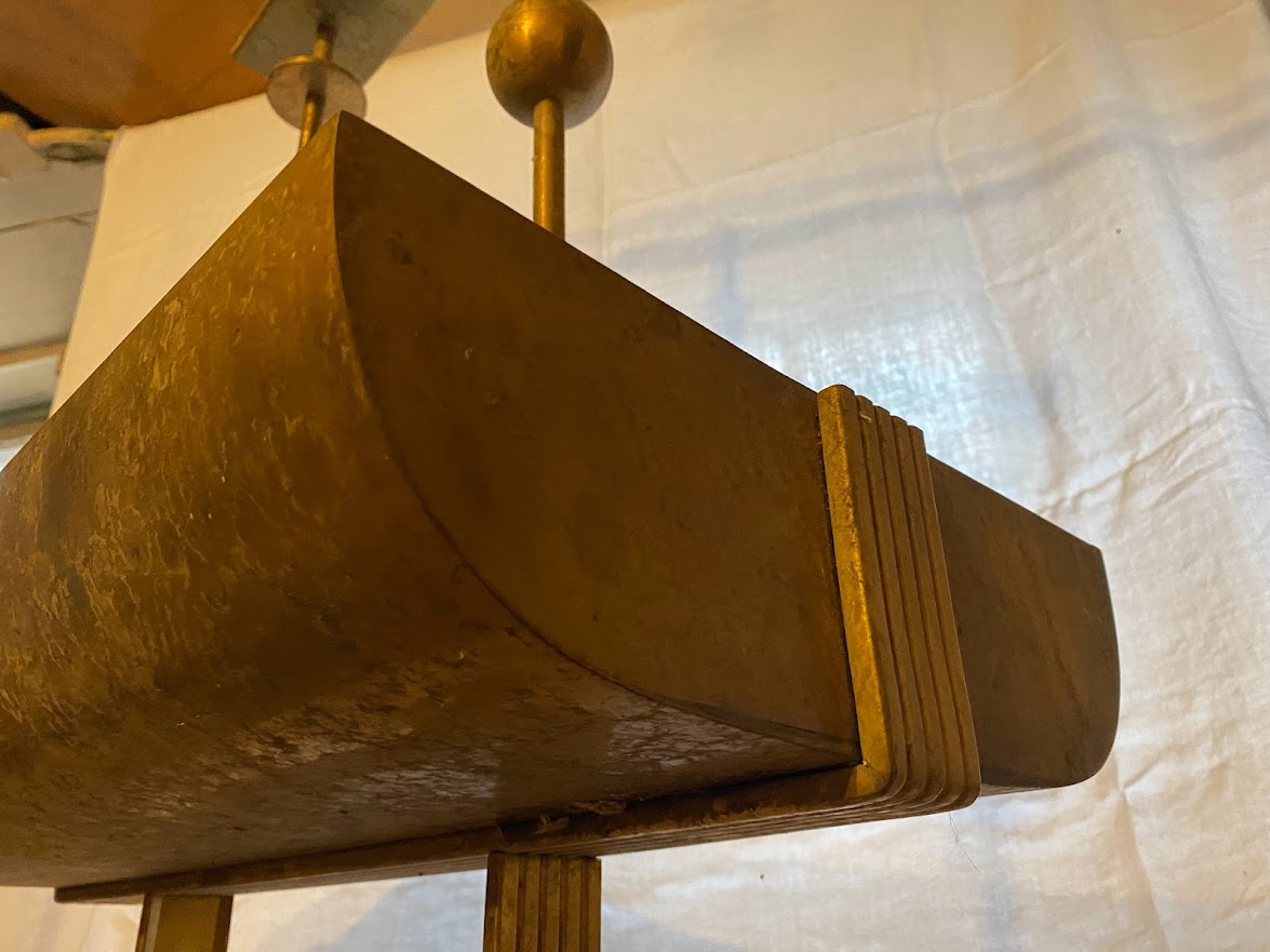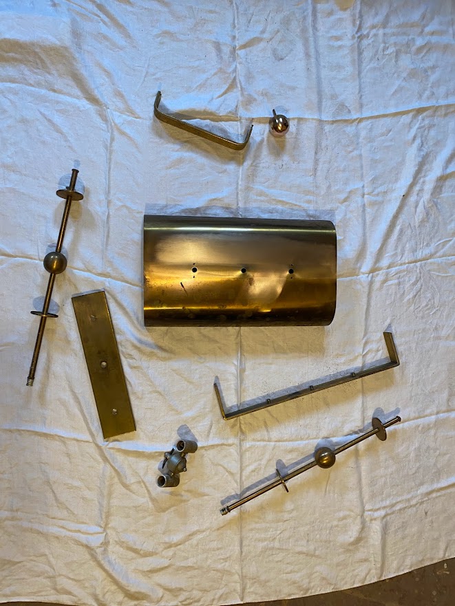 I started the process by taking pictures of every angle of the fixtures. I carefully disassembled the pieces and cleaned the dirt and grime off of them. My next step will be to polish the brass to bring back the beautiful shine and then lacquer it to preserve the luster. After I reassembled it, I will run new wires to the lamp sockets.