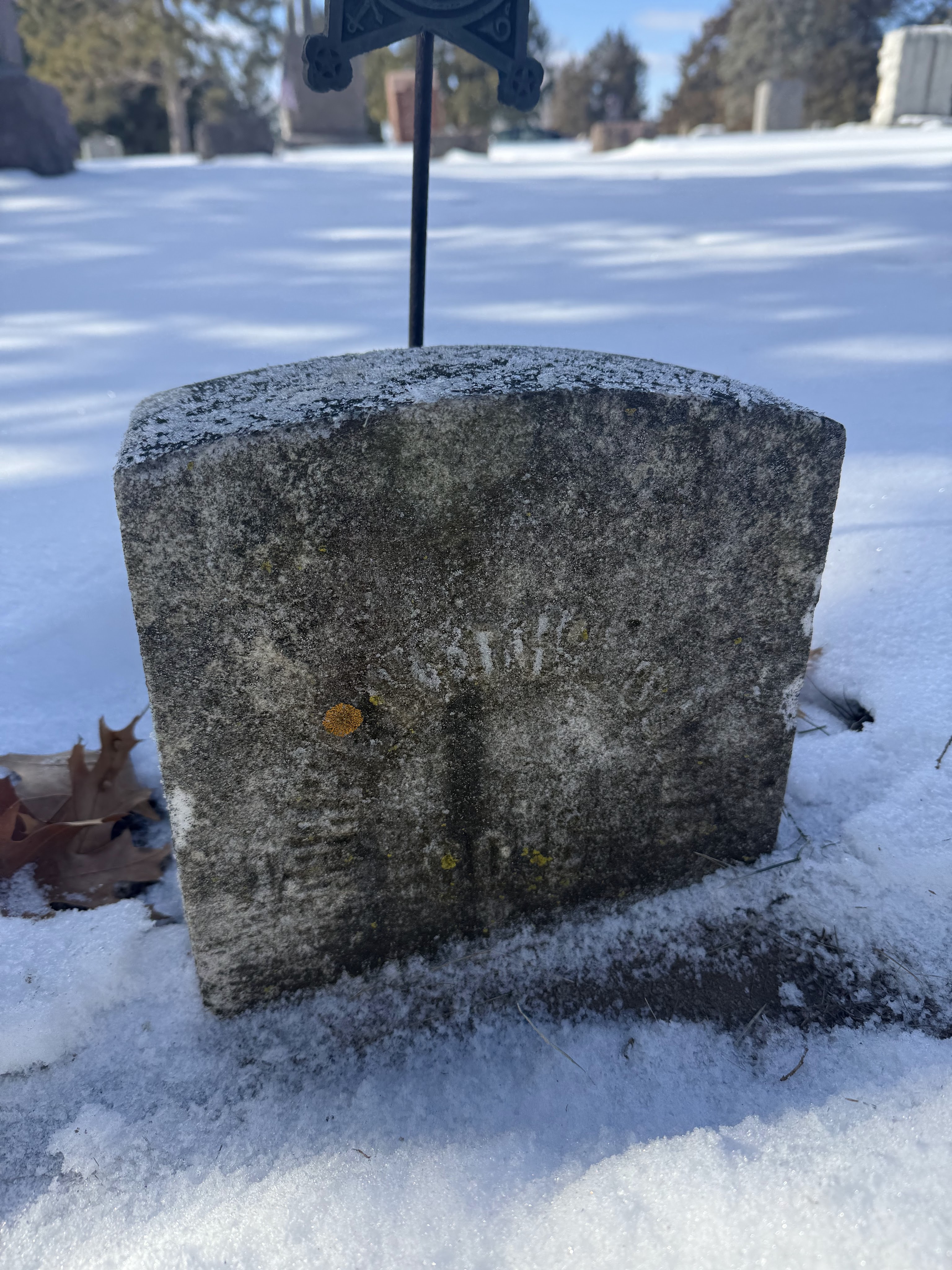 Recently, while attending a work conference in the Wisconsin Dells, I stopped in Portage on my way home to visit Saint Mary’s Cemetery. I had been there once before with my mom, but I was only seven or eight years old at the time. The headstone is very dirty and broken. Worse yet, a part of the stone is missing entirely. It seems to have been damaged long ago and simply cemented back together. Needless to say, it is in need of help.