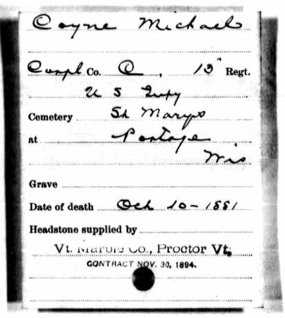 Not long after the family settled in Wisconsin, the Civil War broke out. On December 6, 1862, Michael Coyne traveled to Milwaukee and enlisted in the U.S. Army. According to his service record, he was mustered into Company E of the 13th U.S. Infantry. His regiment participated in several engagements, most notably the Vicksburg campaign. Michael is documented as being sick for several months and was admitted to the hospital at Newport Barracks in Newport, Kentucky. He was discharged from the army in December 1865 at the end of his service, with his final post being Fort Riley, Kansas.