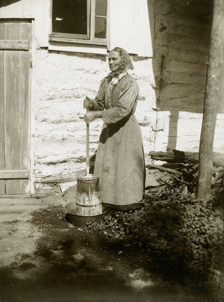 Before refrigeration and the modern grocery store, butter was either made at home or produced locally. Making butter was simply part of everyday life. Butter churns came in all shapes and sizes. The simplest were the dasher-style churns. These were often made of wood or ceramic. A wooden plunger—called a dasher—was moved up and down. It had a disc or a cross at the end. This action agitated the cream until the fat separated and formed butter.